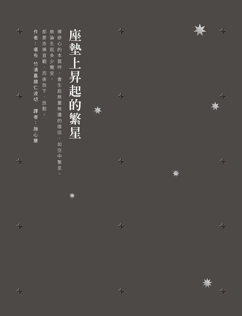 禪修心的本質時,會生起無量無邊的確信,如空中繁星。無量無邊的覺受,會如繁星一般生起, 無論生起多少覺受,都要赤裸直觀,而後放下、放鬆。