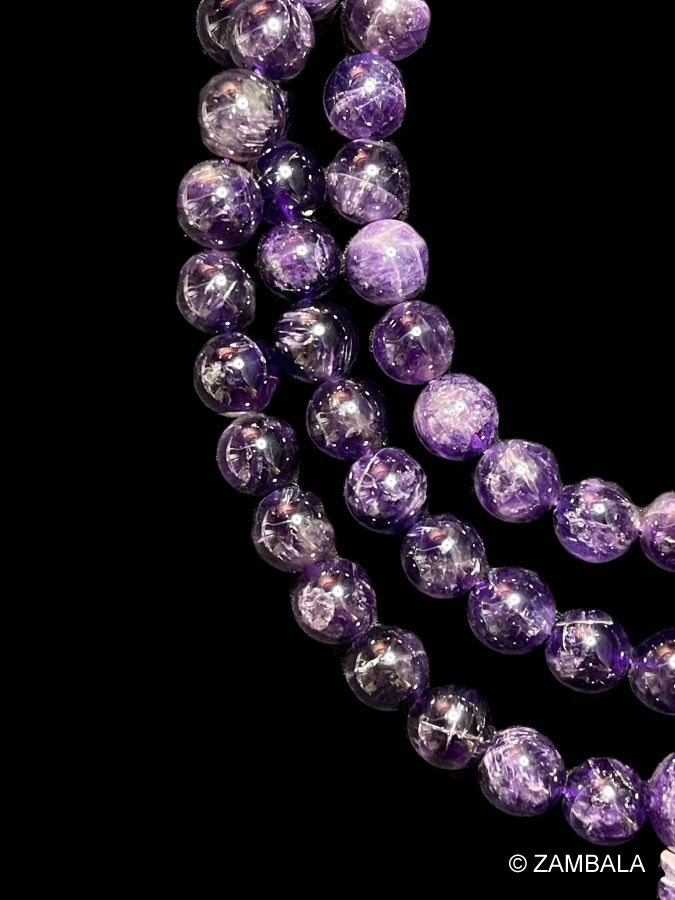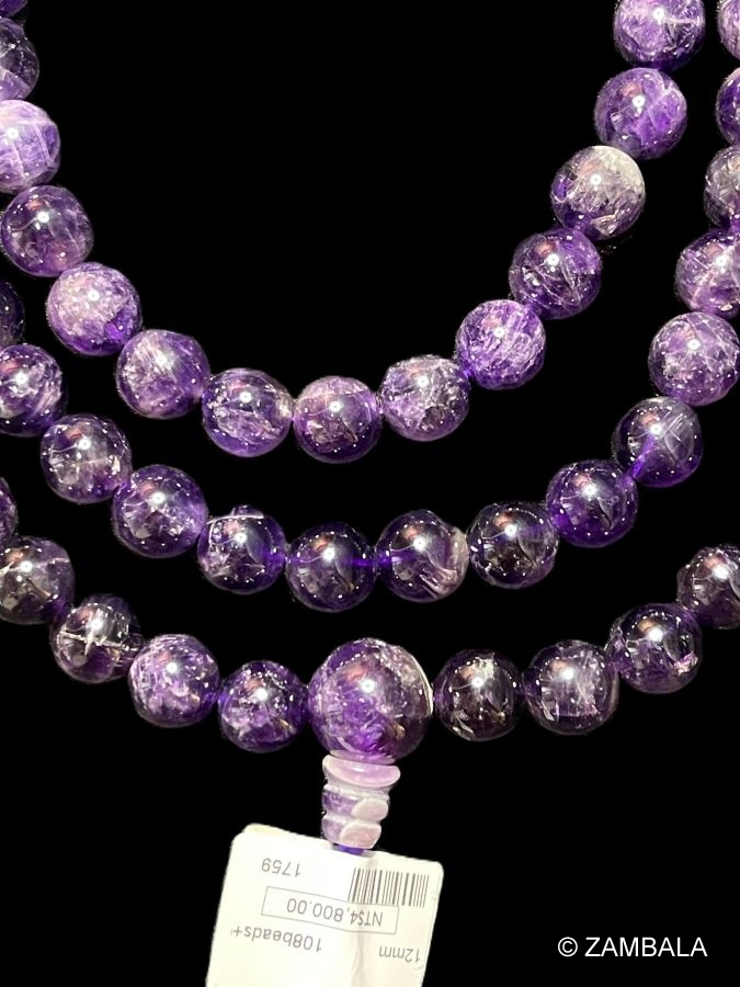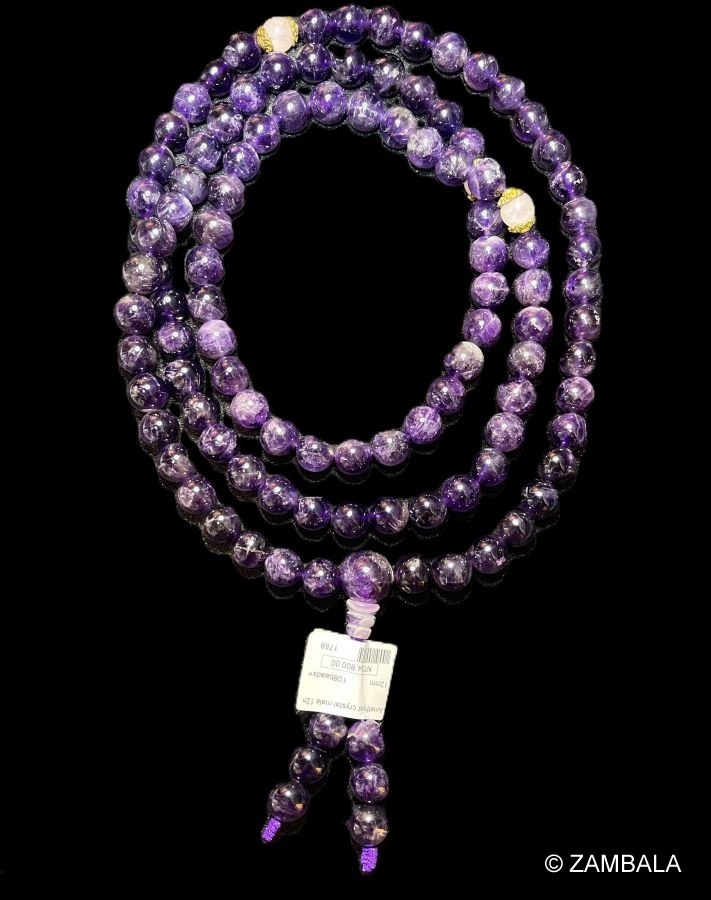 紫水晶念珠本質上是天然石英礦物,因其罕見的紫色與穩定能量,自古被賦予「智慧、清醒、轉化負面情緒」的象徵意義。在藏傳佛教中地位尤其崇高(接近七寶等級),在漢傳佛教則屬於「貴重但非最正統」的選擇。現代佛教徒則多因其美觀與所謂的「能量」而喜愛,成為最暢銷的寶石念珠之一。