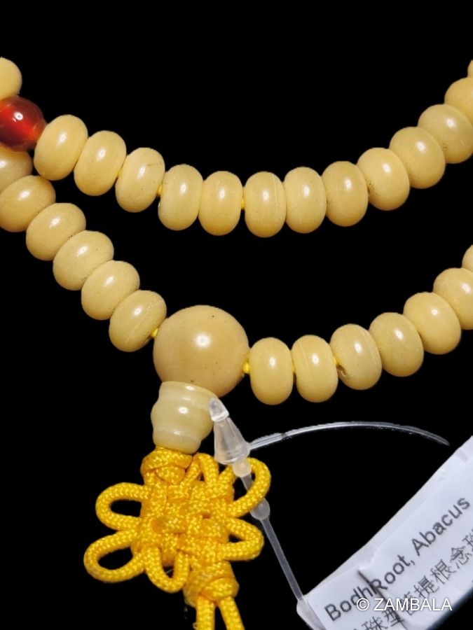 - 菩提根念珠是近15~20年才在漢傳佛教圈流行起來的「新興」念珠材料。早期(2000年前後)多由尼泊爾當地人手工挖取百年以上老樹的根莖,經長年盤玩後呈現象牙白或米白色,質地極其堅硬細膩,因此被稱為「菩提根」。